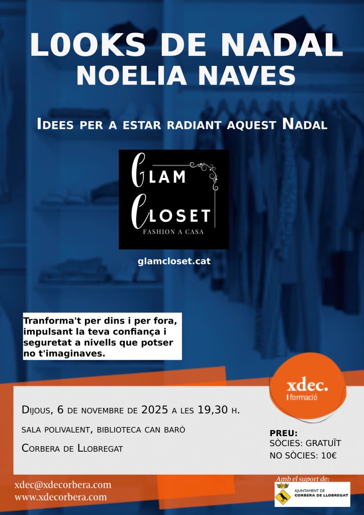 Es tracte del Taller de Looks de Nadal! Que ens donarà idees per a estar radiant aquestes Festes, a càrrec de la Noelia Naves, estilista privada. Té la seva pròpia empresa: Glam Closet, de fashion a casa. La Noelia descobreix i potencia l’estil únic de cada persona. Ajuda a definir què li queda bé, quins colors l’afavoreixen, i a crear looks coherents que reflecteixin la personalitat i l’estil de vida de cadascú. Ordena els armaris de la seva clientela, “Detox d’armari”, n’hi diu, i també és personal shopper, que vol dir que t’acompanya a comprar i t’assessora, adaptant-se als teus gustos i al teu pressupost.