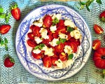 Amanida de maduixots, tomàquet i mató d´aigua de mar